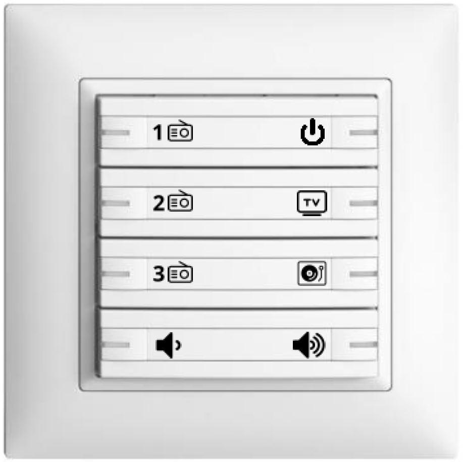 Die Anordnung und Funktionen können frei positioniert und gewählt werden. im Beispiel links mit 3 Favoritentasten, Lautstärke sowie externe Quellen wie TV oder Plattenspieler.
