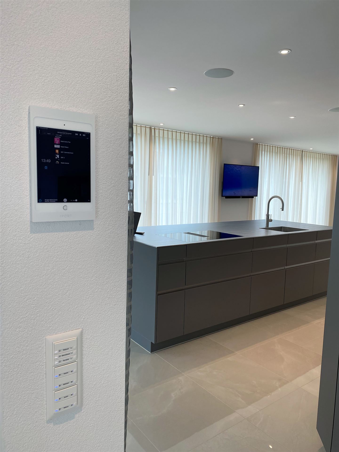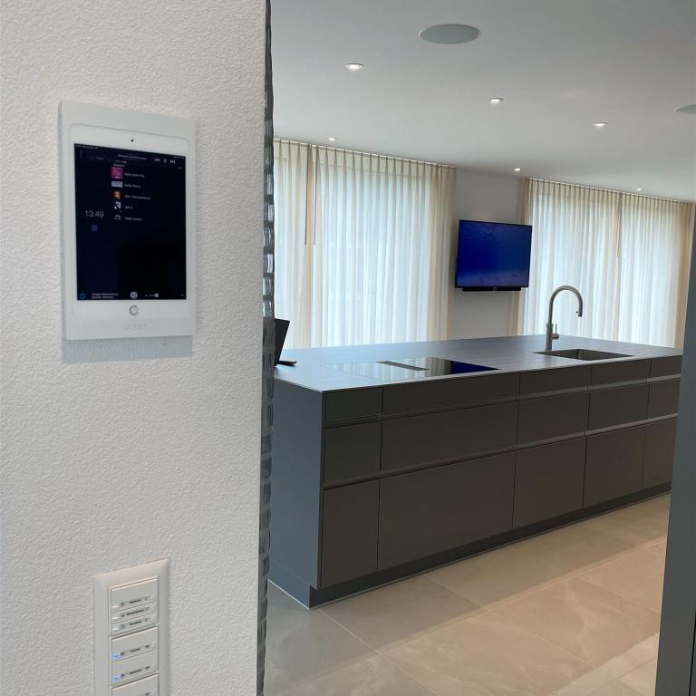Als Bedienung des Systems kann auch in Tablet verwendet werden. Links im Bild ist ein iPad mit passendem Surface Rahmen das fest an die Wand montiert wird (Unterputzdose für Stromversorgung erforderlich). Hier gibt es verschiedene Systeme, Grössen und Farben.